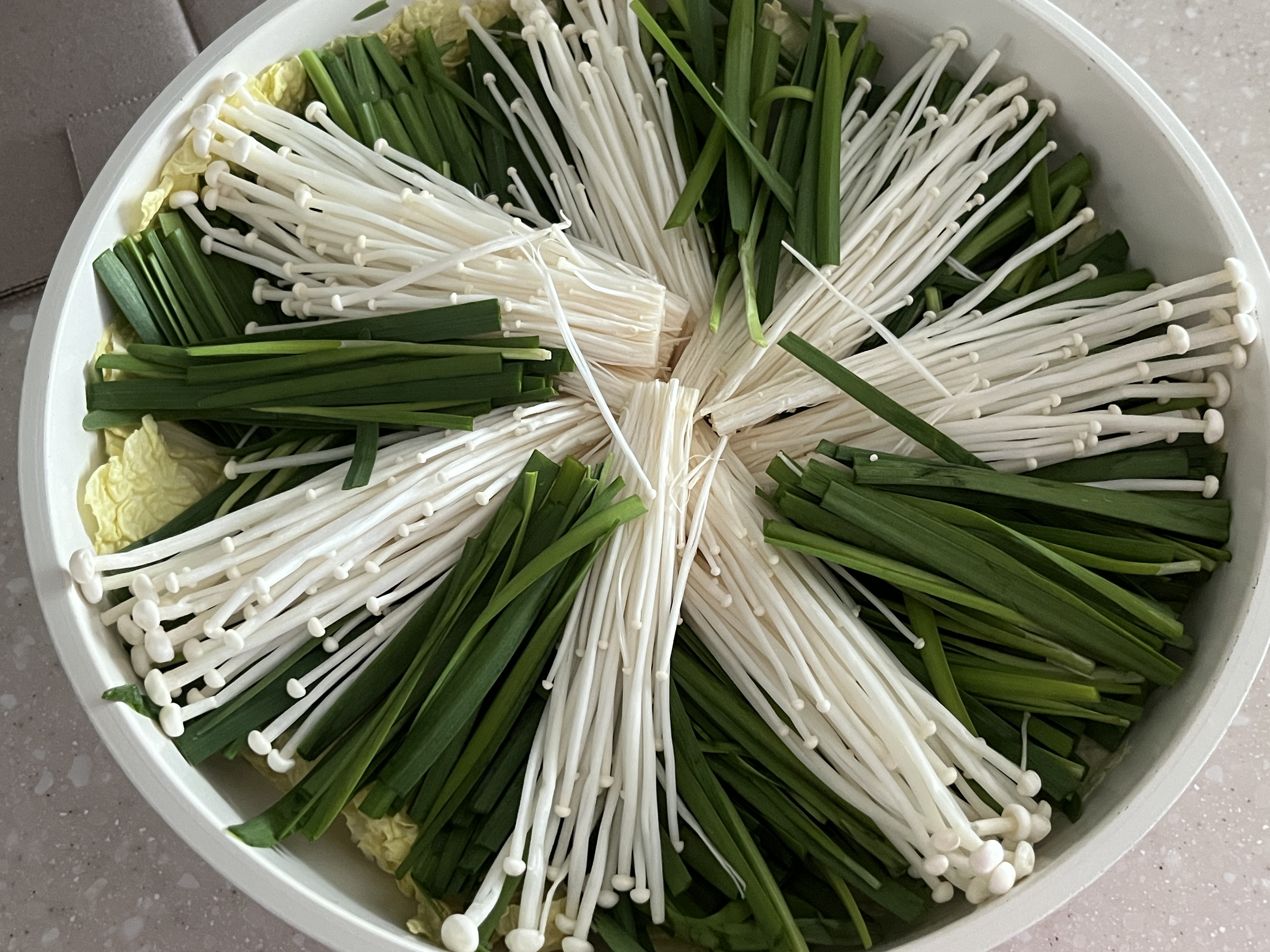 7) 고기를 삶는 동안 부추와 팽이버섯을 넣어 미리 세팅해 두기